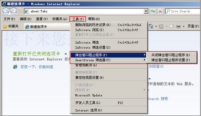 a.在IE菜單中,選[工具]->[ 彈出窗口阻止程序 ]